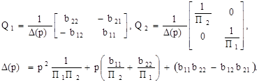 С учетом структуры матрицы Q1 можно утверждать, что для реализации передаточной функции звена полосового типа необходимо выполнить одно из условий b22 =0 или b11 =0. Несложно также установить, что указанные варианты отличаются только номерами ОУ (изоморфные решения). Именно поэтому без потери общности выводов можно положить, что