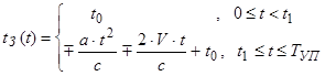 где t0 =2×x0 /c – начальное значение интервала задержки. Смена знака перед выражениями, содержащими скорость и ускорение ЛЦ, связана с уменьшением времени задержки отраженного сигнала при «приближении» ЛЦ к РЛС и увеличением при ее «удалении» соответственно.