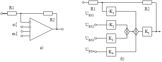 В частности, такой ОУ может иметь n равноправных инвертирующих и m равноправных неинвертирующих входов. На один из инвертирующих входов включается цепь отрицательной обратной связи (ООС), задающая масштабный коэффициент усиления. Коэффициент передачи по каждому из входов при охватывании такого усилителя цепью ООС можно найти из следующих выражений (при условии, что остальные входы заземлены и Ki K5 >>1):