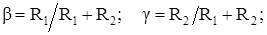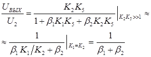При введении нескольких контуров ООС в МОУ происходит взаимное влияние цепей обратной связи на результирующий коэффициент передачи. При включении ОУ инвертирующего усилителя по обеим входам выражения для коэффициентов передачи по каждому входу в области низких частот будут выглядеть следующим образом: