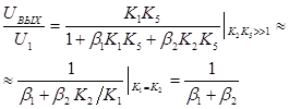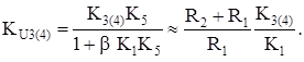 Если считать, что коэффициент передачи повторителя тока на транзисторах VT5, VT6 равен единице, то коэффициенты передачи по напряжению К1 - К4 и К2 - К4 попарно равны и определяются следующим образом: