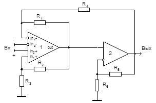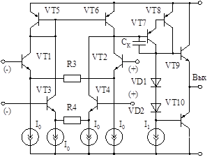 Вариант построения схемы ОУ, соответствующего структурной схеме рис. 1, приведен на рис. 2.