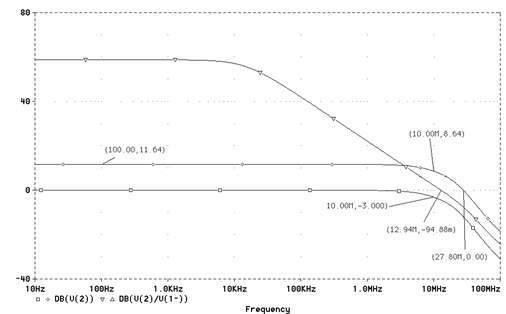 Естественно, частота единичного усиления в этом случае также уменьшается в три раза по сравнению с частотой единичного усиления разомкнутого усилителя.