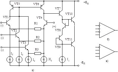 Другой вариант построения многовходового ОУ приведен на рис. 4а), а функциональная схема, ему соответствующая, – на рис. 4б). На рис. 4в приведена функциональная схема, к которой может быть преобразован ОУ, если поменять местами точки подключения коллектора транзистора VT4 и объединенных коллекторов транзисторов VT1 – VT3.