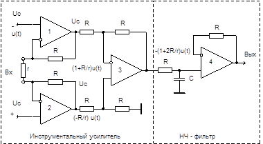 Высокие функциональные возможности МОУ позволяют спроектировать на одном активном элементе не только инструментальный усилитель, но и ограничитель спектра более высокого порядка по сравнению с изделием AD8555. На рис. 19 показана принципиальная схема такого устройства.