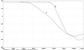 Иная ситуация возникает при выполнении условия К2 > К1 . В этом случае эквивалентная постоянная времени определяется петлевым усилением, частота среза остается неизменной, а частота единичного усиления возрастает. То есть возрастает площадь усиления ОУ, охваченного цепью ООС. Эта ситуация подтверждается результатами моделирования (рис. 3) схемы, приведенной на рис. 2. По стандартному инвертирующему включению КU 1 =1, а при R3 = 2R4 коэффициент передачи К2 » 2К1 с точностью до конечного сопротивления rЭ (см. (5)–(6)).