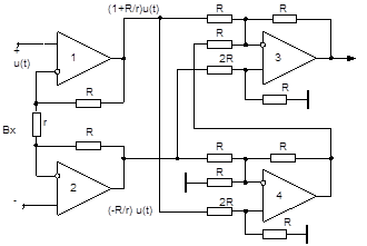 Таким образом, как видно из выражения (111), при идентичности элементов выходной дрейф системы будет определяться конечной разностью не только ЭДС смещения однотипных ОУ, но и их температурных коэффициентов. Достаточно высокая идентичность будет обеспечиваться при реализации всех элементов на одном кристалле, как это сделано, например, в АБMK. Кроме того, в этой схеме осуществляется двукратное расширение диапазона частот по сравнению с классическим инструментальным усилителем.