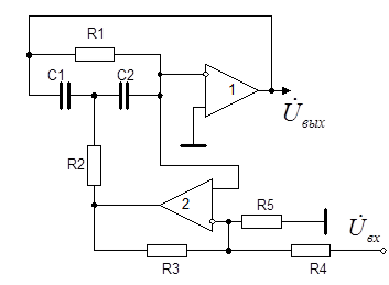 Для уменьшения влияния частоты единичного усиления ОУ и соответствующей параметрической чувствительности необходимо использовать цепи собственной компенсации, а в качестве одного из примеров, демонстрирующих эффективность метода получения схема низкочувствительного звена полосового типа с двумя ОУ (рис. 1).