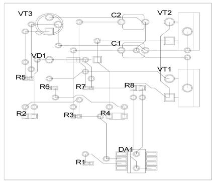 Как видно из выбранного варианта трассировки (пункт 6.3), необходимость определения минимального расстояния для прокладки n-го количества проводников между двумя отверстиями отпадает в виду отсутствия прохождения проводников в узких местах между отверстиями. Расчет электрических параметров печатных проводников (паразитной емкости и индуктивности) производится, главным образом, для высокочастотных устройств. Ввиду того, что проектируемое устройство работает от постоянного напряжения, необходимость такого расчета тоже отпадает.
