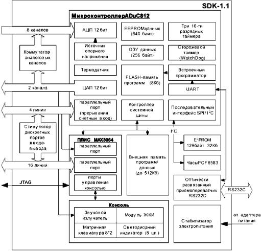 В качестве микропроцессорной системы для проведения проектных работ используется учебный стенд SDK1.1 на базе микроконтроллера ADuC842 с 12-разрядными АЦП и ЦАП, встроенным высокоскоростным МК с ЭРПЗУ (FLASH) на 62 кб. Структурная схема стенда представлена на рис. 2.