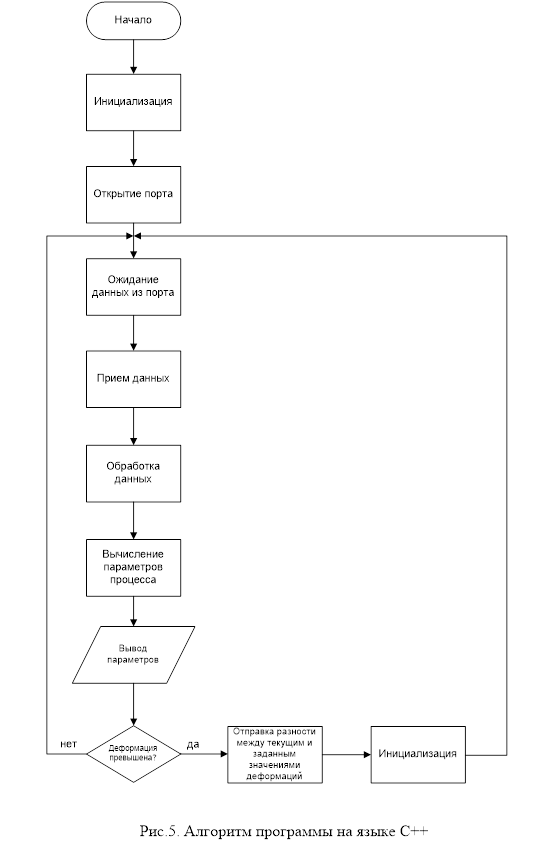 Так, например, в качестве датчика толщинометра использован цифро-аналоговый преобразователь, замкнутый на аналого-цифровом преобразователе. На выходе ЦАП формируется напряжение ≈1.1 В, после преобразований в АЦП и передаче значения через последовательный порт в расчетах в программе на С++ используется значение ≈1, которое использовано в качестве толщины на входе клети. Для моделирования обоих импульсных датчиков угловой скорости используется клавиатура SDK: кнопка «1» прибавляет один импульс, кнопка «2» - десять импульсов, кнопка «3» - сто импульсов. Превышение заданного значения относительной деформации сигнализируется зажиганием нечетных светодиодов (через один), звуковым сигналом и выводом необходимой информации на дисплей, при этом выводится значение разности между текущим и заданным значением деформации. Передача данных между SDK и ПК осуществляется по последовательному COM-порту (RS-232). В качестве ПК используется IBM-совместимый компьютер с наличием последовательного СОМ-порта и операционной системой семейства Windows.
