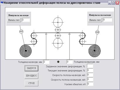 В окне программы имеются поля для вывода рассчитанных и необходимых для расчетов параметров, имеется поле для ввода необходимого значения относительной деформации. Кнопка “ЗАПУСК” открывает COM-порт, моделируя, таким образом, начало технологического процесса. После нажатия на кнопку “Начать счет” какой-либо панели (“Импульсы на входе” или “Импульсы на выходе”) можно моделировать кнопками стенда SDK количество импульсов, пришедших с импульсных датчиков (кнопка 1 – 1 импульс, кнопка 2 – 10 импульсов, кнопка 3 – 100 импульсов). При нажатии на “ПРОЦЕСС” приходят данные со стенда после преобразования ЦАП-АЦП, рассчитываются все имеющиеся параметры и выводятся в соответствующие поля. Кнопка “СТОП” моделирует окончание процесса (закрывается последовательный порт), при ее нажатии обнуляются переменные и поля для вывода.