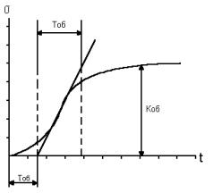 Постоянная времени объекта Тоб – это условное время, в течение которого выходная величина изменилась бы от начального до нового установившегося значения, если бы это изменение происходило со скоростью, постоянной и максимальной для данного переходного процесса. Постоянная времени характеризует инерционность объекта, под которой понимают его способность замедленно накапливать и расходовать вещество и энергию, что становится возможным благодаря наличию в составе ОР сопротивлений и емкостей, препятствующих их поступлению и выходу.