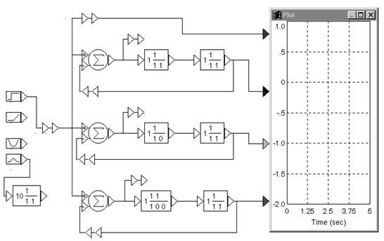 Исследование проводится параллельно на трех идентичных моделях (рис. 28). Модель содержит два линейных звена, задаваемых передаточными функциями. Передаточную функцию второго звена принять равной К/(1 + pT), а первого – в зависимости от типа системы: для статической – 1/(1 + p), для астатической первого порядка – 1/p, для астатической второго порядка – (1 + р)/p2.