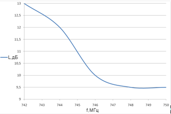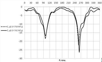 На частоте 742 МГц сигнал подавляется на 10 дБ в секторе углов 30 градусов. При этом в диапазоне секторов 20-150 градусов подавление на 4 дБ.