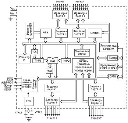 Устройство формирования временных интервалов предназначено для формирования и выдачи внутренних синхросигналов фаз, тактов и циклов. Количество машинных циклов определяет продолжительность выполнения команд. Практически все команды ОЭВМ выполняются за один или два машинных цикла, кроме команд умножения и деления, продолжительность выполнения которых составляет четыре машинных цикла. Обозначим частоту задающего генератора через Fг . Тогда длительность машинного цикла равна 12/Fг или составляет 12 периодов сигнала задающего генератора. Логика ввода - вывода предназначена для приема и выдачи сигналов, обеспечивающих обмен информации с внешними устройствами через порты ввода вывода Р0-Р3.