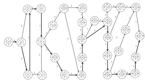 Если удельный вес работ критической и субкритической зон превышает 50%, то сеть оказывается перенапряженной и необходимо пересмотреть ее топологию с тем, чтобы увеличить количество работ, выполняемых параллельно.
