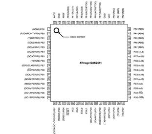ATmega1281 обеспечивает следующие топологические элементы: 128K байт. в системе Программируемый Перепрограммируемый памяти. СППЗУ -4 КБ, 8 КБ SRAM, 54 универсальных линии ввода – вывода, 32 универсальных рабочих регистратора. Кроме всего этого встроенный счетчик реального времени, шесть гибких Таймеров/Счетчиков с режимами сравнения и PWM, 2 USARTs, 2 лини - формируют соединения Последовательный интерфейс, аналого-цифровой преобразователь на 10 битов с 8 каналами с дополнительной дифференциальной входной стадией с программируемым коэффициентом усиления, программируемый Охранный Таймер с Внутренним Осциллятором, SPI последовательным портом. Внешний вид микроконтроллера в корпусе QPLF64 представлен на рисунке 13.1.1