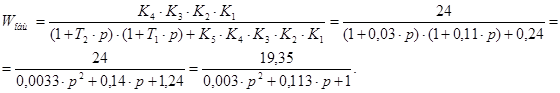 Подставив заданные параметры колебательного звена k=19,35 Т1 =0,0725, Т2 =0,04, получим следующее выражение:
