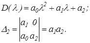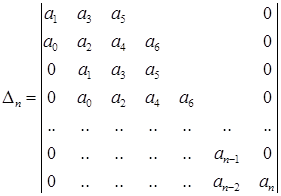 Это алгебраический критерий, по которому условия устойчивости сводятся к выполнению ряда неравенств, связывающих коэффициенты уравнения системы. В разной форме этот критерий был предложен английским математиком Е. Раусом и затем швейцарским математиком А. Гурвицем в конце прошлого века. Приведем без доказательства этот критерий в форме Гурвица.