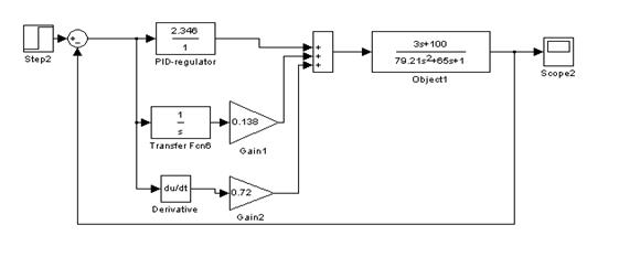 ПИД-регулятор можно представить как параллельное соединение пропорционального, интегрирующего и дифференцирующего звеньев. Коэффициент передачи пропорционального звена в соответствии с расчетом, приведенным выше, равен 2.346, коэффициент передачи интегрирующего звена равен