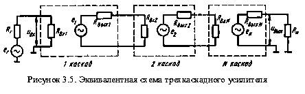 Как пример рассмотренного на рисунке 3.5. показана эквивалентная схема трехкаскадного усилителя, на которой каждый каскад представлен активным четырехполюсником.