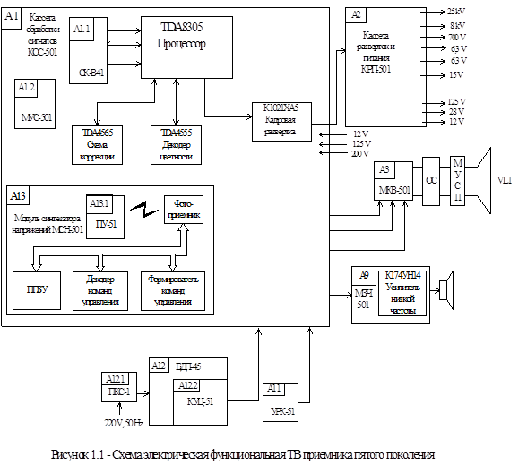 В соответствии с ней телевизор состоит из кассеты обработки сигналов КОС-501. Она содержит модули СКВ-41Е2К всеволнового селектора каналов, двухстандартные усилители промежуточной частоты изображения (УПЧИ) и усилители промежуточной частоты звука (УПЧЗ) радиотракта на 6,5 и 5,5 МГц, собранные на микросхеме (МС) TDA 8305. Декодирование сигнала цветности (СЦ) PAL/SECAM производится в МС TDA 4555. В ней выполняется коррекция высокочастотных (ВЧ) предыскажений, задержка и запоминание через строку (СЦ), их разделение, усиление прямого и задержанного сигналов, а также частотное детектирование. Сигнал яркости (СЯ) через эмиттерный повторитель подается на декодер цветности. Полученные цветоразностные сигналы (ЦРС) красного и синего поступают на схему коррекции СЦ на МС TDA 4565, где повышается четкость границ между деталями изображения за счет уменьшения длительности цветовых переходов, а также происходит необходимая задержка СЦ с помощью УЛЗ-64-8. Задержка СЯ производится специальной гираторной линией, которая входит в состав МС TDA 4565. Кроме этих узлов в этой же кассете размещаются кадровая развертка на МС К1021ХА5 и модуль устройства согласования МУС-501 для коммутации сигналов внешних устройств. Кассета разверток и питания КРП-501 также входит в состав телевизора и содержит модуль строчной развертки с корректором вертикальных линий и сплиттрансформатором типа ТДКС-4 или ТДКС-19 для питания накала и электродов кинескопа, и модуль импульсного питания телевизора с устройством размагничивания кинескопа (УРК). Также в состав ТВ приемника входят кроме указанных унифицированных узлов также модуль звуковой частоты МЗЧ-501 и синтезатор напряжений МСН-501 [5].