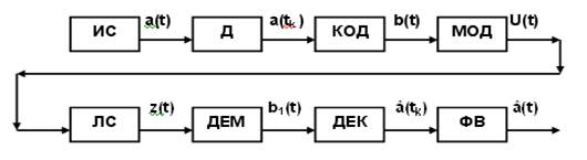 Объектом расчета является цифровая система передачи непрерывных сообщений с импульсно-кодовой модуляцией по каналу с шумом. Структурная схема системы приведена на рис. 2.