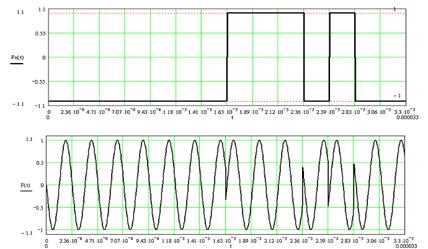 Для эффективной передачи сигнала по каналу связи необходимо его спектр перенести в высокочастотную область - промодулировать сигнал. В качестве модуляции используется фазовая манипуляция с частотой несущего колебания 42МГц и разностью фаз для сигналов 0 и 1 равной π/2.