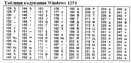 2. Здійснити перекодування Вашого повідомлення в двійкову послідовність із застосуванням для представлення символів Вашого повідомлення восьмибітових символів кодів таблиці Windows 1251 (див. надану нижче таблицю).