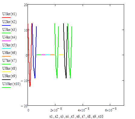 Надайте та позначте відображення сигналів кожної із 10 дискрет у часовій (на часовому інтервалі 0 - 10 τ) та частотній областях. Зробіть відповідні висновки щодо спектрів відображених сигналів.