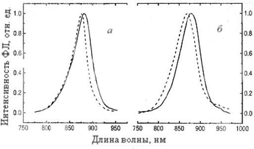 наблюдается сдвиг ИК максимума в длинноволонвую область спектра и расширение полосы ФЛ (рисунок 2, а). Такой же сдвиг максимума, но без уширения полосы наблюдается у образцов с
