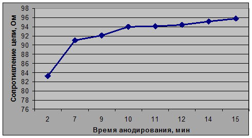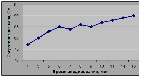 В процессе анодирования снималась вольт-амперная характеристика, по которой впоследствии была определена динамика изменения сопротивления цепи (рисунки 13, 14).