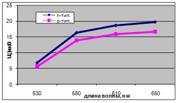 Как видно из приведённого графика, приближаясь к длине волны красного цвета, величина фотоответа замедляет свой рост, что позволяет сделать предположение о том, что максимум фотолюминесценции приходится на длину волны порядка 650 нм.