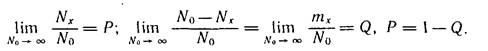 Если в рассматриваемый момент времени t = tx имеется Nx работающих изделий, a mx = N0 -Nx вышли из строя, то опытная статистическая вероятность безотказной работы P* = NX /N0 , а опытная статистическая вероятность отказов Q* = (N0 - Nx ) /N0 = mx /N0 , где Р* и Q* характеризуют частоту отказов в данном опыте и являются оценками соответствующих "математических" вероятностей, которые определяются как пределы: