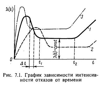 Зависимость интенсивности отказов от времени может быть определена экспериментально (рис. 7.1). Анализируя полученную кривую I, снятую, допустим, при испытаниях в нормальных условиях, можно отметить три временных интервала: 1) от 0 до t1 — время приработки (1—1,5%) всего времени испытаний, 2) от t1 , до t2 — время нормальной работы, 3) от t2 до °° — время старения. Время приработки характеризуется повышенным числом отказов и определяется проявлением технологических и производственных дефектов, время нормальной работы — высокой надежностью испытуемых изделий (интенсивность отказов на этом интервале практически постоянна).