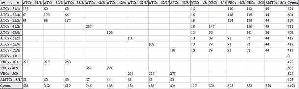 Таблица 11.2 Структурная матрица потоков пропорционально ёмкости станций