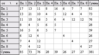| От / к | Пл.1 | Пл.2 | Пл.3 | Пл.4 | Пл.5 | Пл.6 | Пл.7 | Пл.8 | сумма |