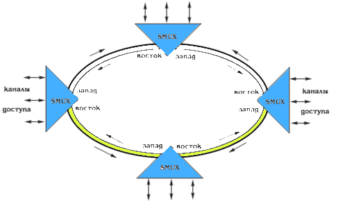 Эта топология широко используется для построения SDH сетей первых двух уровней SDH иерархии. Основное приемущество этой топологии – лёгкость организации защиты типа 1+1, благодаря наличию в синхронных мультиплексорах SMUX двух пар оптических каналов приёма / передачи: восток – запад, дающих возможность формирования двойного кольца со встречными потоками.