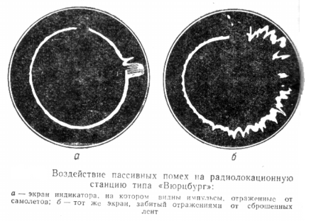 Первое применение пассивных помех было очень эффектным. Во время налета английских бомбардировщиков на Гамбург операторы немецких РЛС системы противовоздушной обороны были поражены необычным явлением. Отраженные от самолетов импульсы, наблюдаемые на экранах индикаторов РЛС, начали постепенно расползаться, необычно увеличиваясь по амплитуде, и через некоторое время заняли большую часть экрана. Работа системы ПВО была дезорганизована. В этом налете англичане потеряли самолетов в несколько раз меньше, чем в предыдущих налетах. Так в июле 1943 г. были впервые применены пассивные помехи в виде металлизированных лент. Ниже приведены изображения с экрана индикатора РЛС “Вюрцбург” без помех и при наличии пассивной помехи.