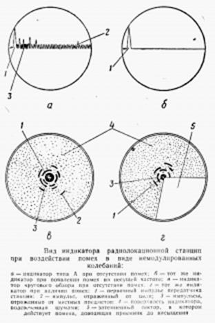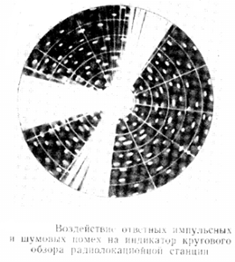 Довольно широкое распространение получили помехи с импульсной модуляцией. Импульсы помехи выглядят на экране индикатора примерно так же как сигналы, отраженные от цели. При большом количестве импульсов помех выделение сигналов от цели становится затруднительным. Если частота следования импульсных помех отличается от частоты следования импульсов радиолокатора и не кратна ей, то импульсы помех будут “пробегать” по экрану, маскируя истинные цели. Однако при внимательном наблюдении сигнал от цели всегда можно отличить от импульса помехи по медленному перемещению его.