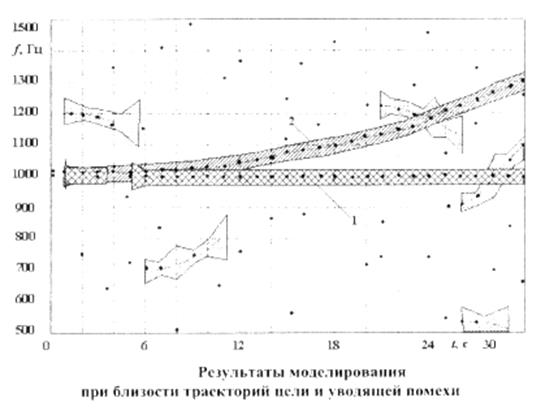 На рисунке видно, как “завязываются” траектории по близко расположенным отметкам от предполагаемой цели и прекращается построение траекторий, когда отметки в ожидаемом диапазоне не появляются. Вверх пошла траектория слежения за помехой, уводящей по скорости. Временно цель была потеряна, но потом траектория “завязалась” и сопровождение цели возобновилось. Но теперь уже сопровождаются две цели, одна из которых ложная.