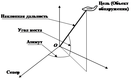 Радиолокация обеспечивает определение координат объекта по отраженному от него радиосигналу. Координаты определяются относительно места расположения радиолокатора, и основными являются две угловых координаты: азимут и угол места, и наклонная дальность. Их определение поясняется следующим рисунком.