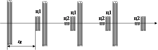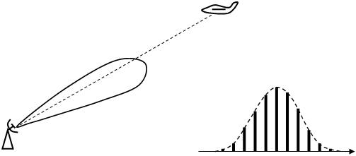 При этом от каждой цели, находящейся в зоне обзора, формируется сигнал примерно колокольной формы, по максимуму которого измеряется направление на цель. Для импульсного излучения форма сигнала на выходе приемника (последовательность импульсов) показана на рисунке выше справа. Такой сигнал называют пачкой импульсов.