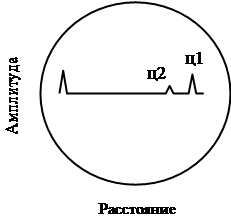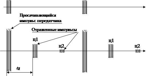 При высокой частоте повторения отраженный импульс от дальней цели ц2 придет не в первый промежуток между импульсами, а в последующий. Осциллограмма на индикаторе изменится.