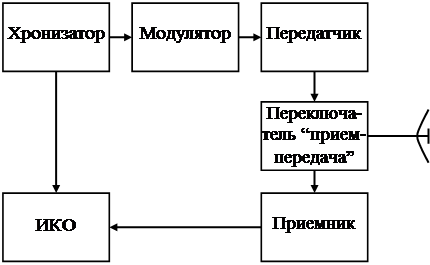 Передатчик генерирует последовательность коротких высокочастотных импульсов. Он управляется импульсами модулятора, длительность и частота повторения которых задаются хронизатором. Хронизатор также формирует импульсы для запуска развертки индикатора кругового обзора, совпадающие по времени с излучаемыми импульсами. Отраженные импульсы усиливаются и детектируются в приемнике и подаются далее на ИКО для управления яркостью луча. В ИКО используется радиальная развертка, вращающаяся синхронно с вращением антенны.