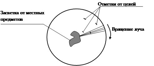 Движение луча начинается с центра экрана и заканчивается у края трубки. Центр экрана соответствует нулевой дальности, т.е. расположению радиолокатора, а край – максимальной просматриваемой дальности. Для индикации цели используется яркостная отметка. Другими словами, если в индикаторе типа А появление отраженного импульса приводит к отклонению луча от прямой линии, то в ИКО во время прихода импульса увеличивается яркость свечения луча.