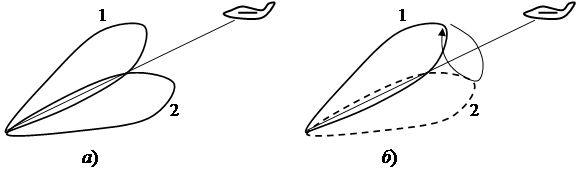 Пеленгацию по равносигнальному направлению можно реализовать различными способами. Можно взять две антенны с пересекающимися диаграммами направленности (рис а), подсоединить их к приемникам и сравнивать выходные сигналы приемников U1 и U2 , Если U1 > U2 , то цель отклонилась влево от равносигнального направления, если U1 < U2 , то – вправо, а если U1 = U2 , то цель находится точно на равносигнальном направлении.