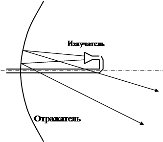 Но в 40-е годы (во время второй мировой войны) нашли другое решение: использовали круговое вращение диаграммы направленности. Это эквивалентно поочередному подключению к приемнику одну за другой четырех антенн с пересекающимися диаграммами направленности, только вместо ступенчатого перехода диаграммы направленности из одного положения в другое этот переход стал плавным. Конструктивно такое вращение осуществлялось просто. Станции орудийной наводки работали в СВЧ диапазоне, и антенна представляла собой параболоид вращения, в фокальной плоскости которого располагался излучатель – полуволновый вибратор или рупор. Если этот излучатель сместить относительно оси параболоида, то максимум излучения антенны не будет совпадать с осью антенны, что поясняется рисунком ниже.