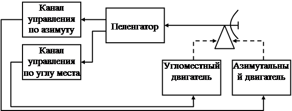 Она содержит два независимых канала управления: по азимуту и по углу места. Если самолет находится на равносигнальном направлении, то напряжение на обоих выходах пеленгатора (по азимуту и углу места) равно нулю, на двигатели никакого напряжения не подается и антенна остается в прежнем положении. Смещение самолета с равносигнального направления приводит к появлению напряжения на выходе пеленгатора и к развороту антенны до тех пор, пока напряжение на выходе пеленгатора не станет равным нулю, т.е. пока равносигнальное направление не совпадет с направлением на цель.